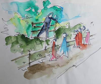 Als Ort für die Skulptur dient ihm nicht ohne Zufall der Teil des Aaseitenwegs, der durch den bischöflichen Garten führt und der 1956 auf Wunsch der Stadt, vom damaligen Bischof Michael Keller (1896-1961), auch für die Öffentlichkeit zugänglich gemacht wurde.